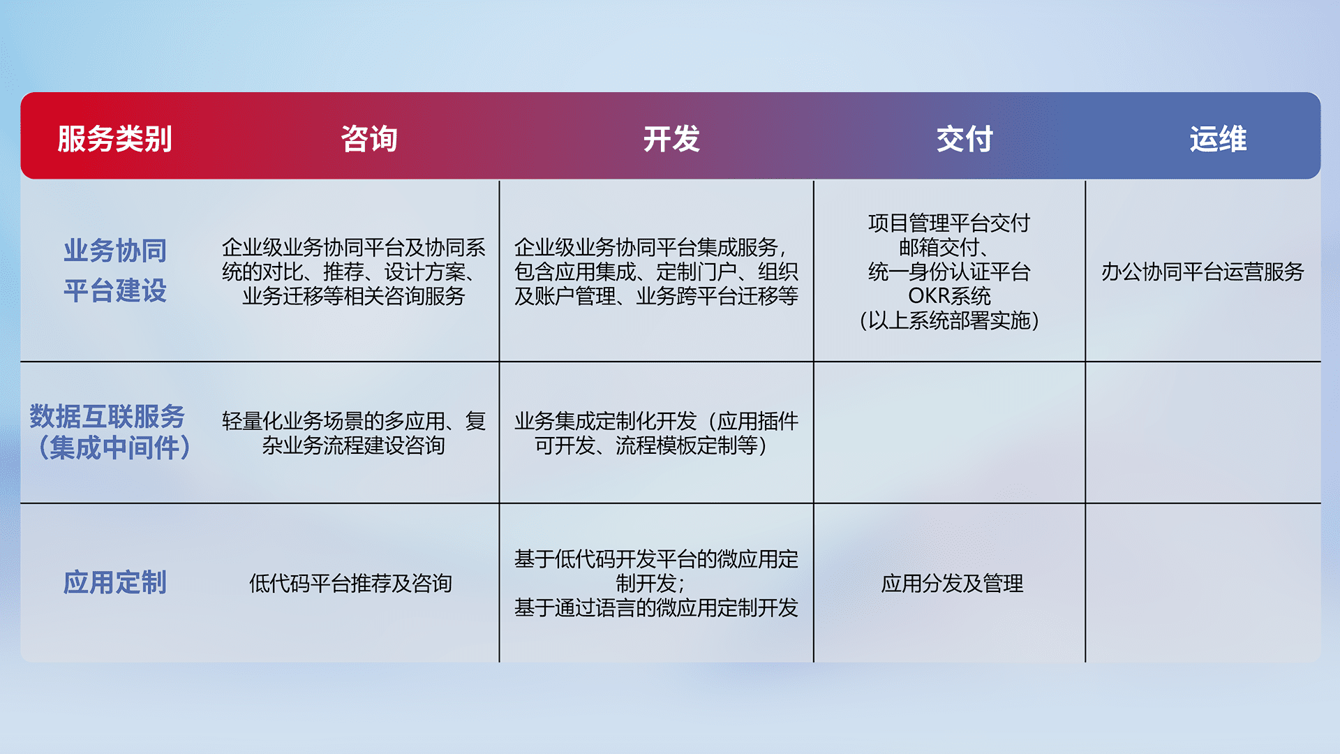 针对钉钉、、、、企微、、、IDaas等平台级产品提供产品的规划、、、方案、、、、交付、、、、定制化开发等服务,,,,实现如统一协同办公、、、、智能客户服务、、、混合会议管理、、、、智能数据查询、、等业务场景,,,,实现数字化转型。。。